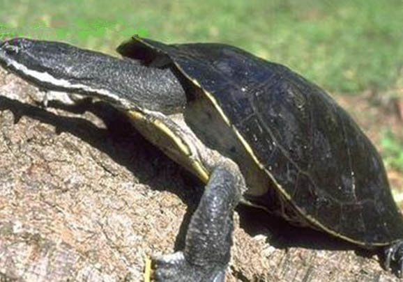 黄头侧颈龟小时候,身体颜色很鲜艳,等它长大后背甲的颜色就会加重。